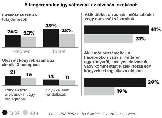 Másrészt véleményünk szerint az olvasás nem azért fontos, hogy a fizikai könyvek vevőre találjanak, hanem azért, hogy a regényekben, szakkönyvekben meglévő információt, tapasztalatot és tudást az olvasók megismerhessék. Ez pedig platformtól független dolog: a lényeg, hogy az emberek leüljenek és időt fordítsanak az olvasásra. A USA Today és egy online könyvkeresésre, -vásárlásra szakosodott oldal, a Bookish nemrégiben megjelent felmérése szerint a tabletek és e-könyv-olvasók tulajdonosai pontosan ezt teszik. Többet és gyakrabban olvasnak, mint az e-könyvek olvasására alkalmas eszközökkel nem rendelkező honfitársaik.