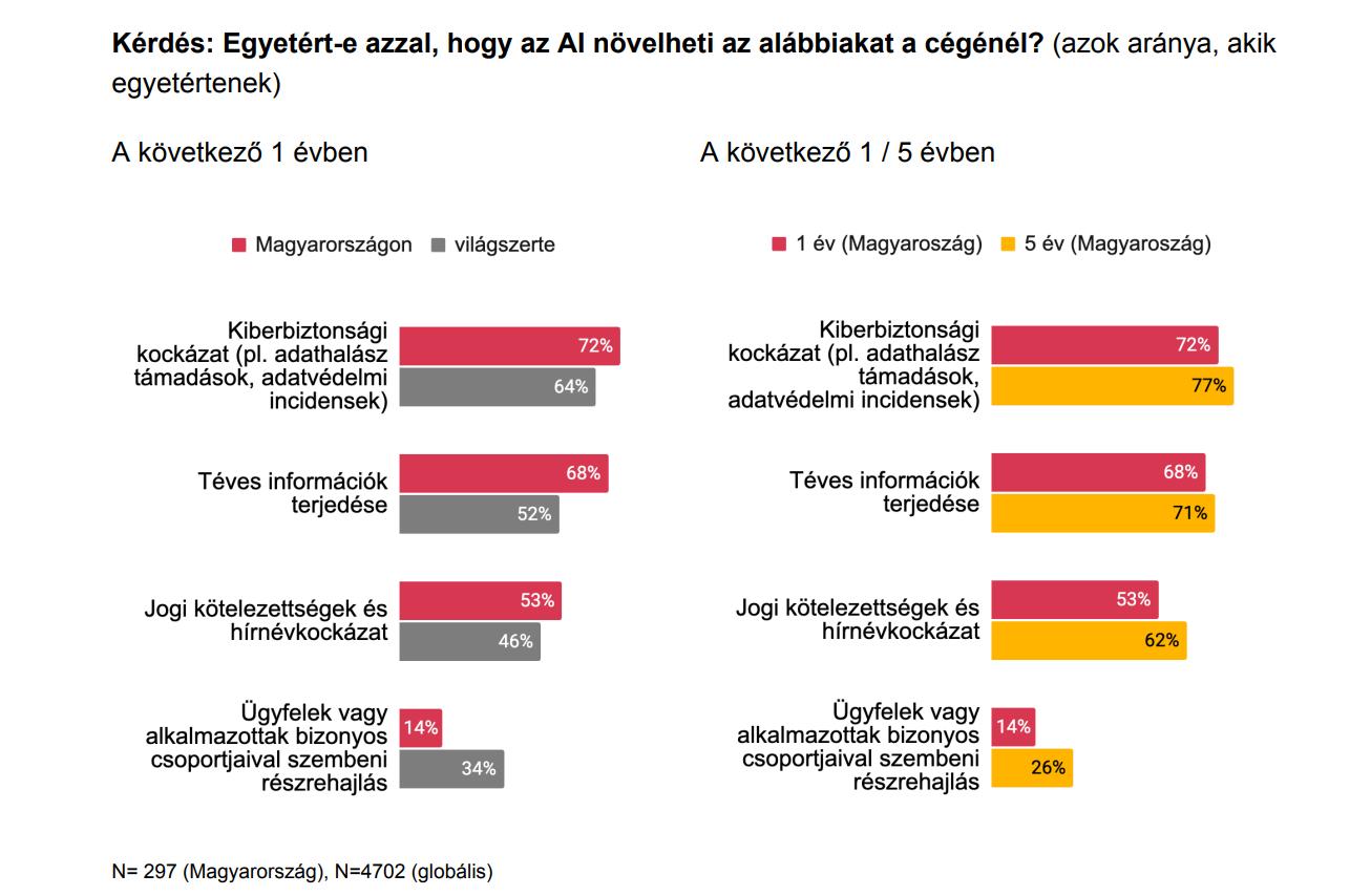 A többség negatív következményekkel is számol. Közel háromnegyedük szerint (72 százalék) már egy éven belül is jelentősen növeli a kiberkockázatokat, téves információkat terjeszt (68 százalék), továbbá jelentős a jogi- és a hírnévkockázata is (53 százalék).