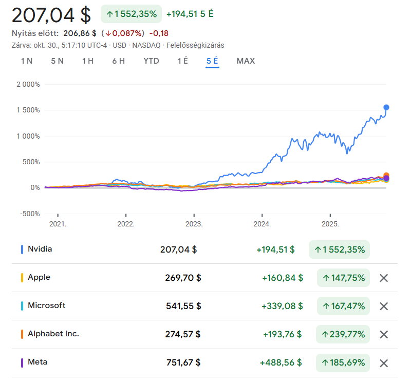 Az Nvidia és más big tech vállalatok árfolyamának alakulása az elmúlt 5 évben (forrás: Google Finance)