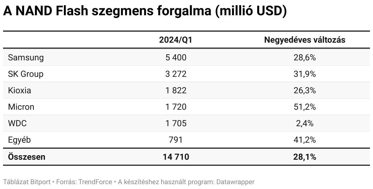 Miközben a területet uraló Samsung és a második SK Group piaci tortaszelete szinte változatlan maradt, a többi szereplő között ádáz verseny dúl a dobogó legalsó fokáért. Ezt az első negyedévben a Kioxiának sikerült megszereznie, amely a következő negyedévben további 20 százalékos forgalomnövekedésre számít.
