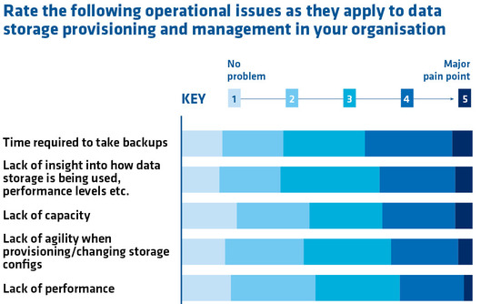 A konferencián részt vett CIO-k többsége azonban másképp tekint a tárolási problémákat megoldani hivatott stratégiára; a megbízhatóságot és rendelkezésre állást hátra sorolták a fontossági ranglistán. Ehelyett inkább a biztonsági mentések ideje került fókuszba, amit az adattárolók felhasználási módjába való betekintés tökéletlensége követett, vagyis az, hogy az informatikai vezetők nem rendelkeznek naprakész információkkal arról, mi is történik pontosan a storage-eken.