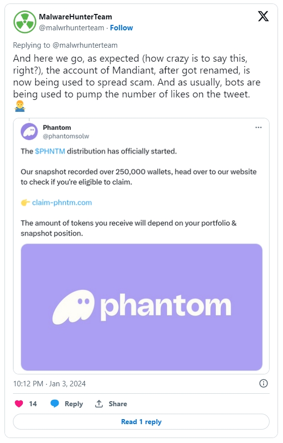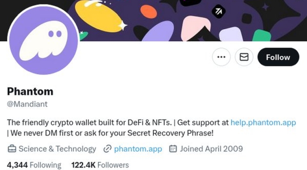Első körben kicserélték a Mandiant képét a fiók nevét pedig @phantomsolw-ra változtatták. Mindezt annak érdekében, hogy a csatorna az egyébként teljesen legitim módon működő Phantom kriptotárca egyik hivatalos fiókjának tűnjön. A támadók a hitelesség látszatának megteremtése érdekében a valódi Phantom-fiók néhány bejegyzését is újraosztották, köztük azt is, ami arra figyelmezteti a felhasználókat, hogy ne kattintsanak mindenféle linkekre elhamarkodottan.