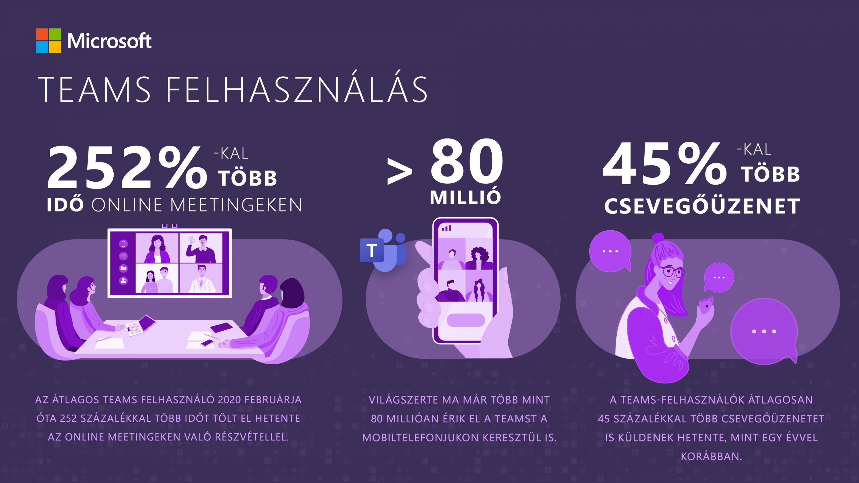 A legutóbbi Work Trend Index (WTI) felmérés szerint világszerte a munkavállalók 38 százaléka dolgozik ma már hibrid körülmények között, Magyarországon pedig a járvány előtti 2 százalékról 9 százalékra emelkedett a távolról dolgozók aránya. Az átlagos Teams-felhasználó 2020 februárja óta 252 százalékkal több időt tölt el hetente az online meetingeken való részvétellel és világszerte ma már több mint 80 millióan érik el a Teamst a mobiltelefonjukon keresztül is. A Teams-felhasználók átlagosan 45 százalékkal több csevegőüzenetet is küldenek hetente, mint egy évvel korábban.