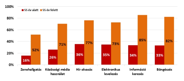 Az eNET - Telekom Jelentés az internetgazdaságról felméréssorozatának legújabb darabja az 55 év feletti korosztály internethasználati szokásaival foglalkozik. A tanulmány hivatkozik a 25 ezer fős sokaságra épülő Nemzeti Olvasottság Kutatás (NOK) adataira, amely alapján 2013 második negyedévében az idősebb korosztály negyede használt internetet, ami jelentősen elmarad az országos átlagtól (61%). A KSH 2012-es felmérése szerint viszont a már számítógépet használó 55 év felettiek 71 százaléka napi rendszerességgel használ számítógépet, ami nem sokkal marad el a 16-24 éves korosztály 88 százalékos eredményétől.