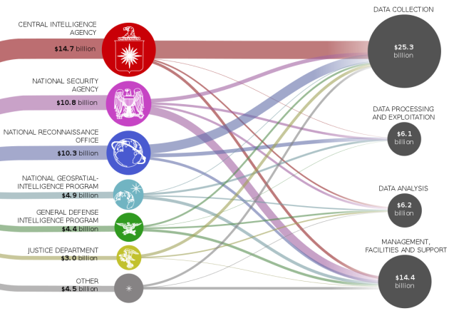 Az IDC csak a dokumentált összeget, azaz az 52,3 milliárdot veszi figyelembe az elemzésénél, bár azt a közlemény is megjegyzi, hogy az amerikai hírszerzés teljes költségvetését többen 52,6 milliárdra becsülik, részben a Snowden kiszivárogtatta információk alapján. Ennek az irdatlan összegnek egy jelentős része megy informatikára. Emellett további 400 millió dollárba került az, hogy különböző kormányzati szerveknek együtt kellett működniük valamelyik hírszerző szervezettel. (A Washington Post készített egy nagy infografikát arról, hogy az amerikai hírszerző szervezetek mire mennyit költenek, ami alapján Martin Grandjean készítette a fenti kivonatot.)
