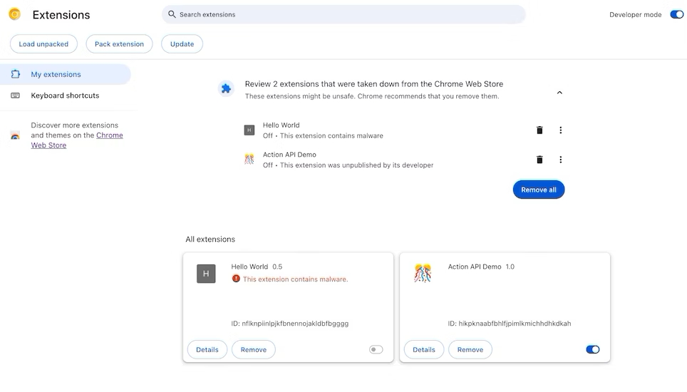 A rosszindulatú kódokat tartalmazó bővítményeket a Google automatikusan letiltja, ám ettől függetlenül érdemes mihamarabb eltávolítani ezeket a bőngészőről, és ezzel együtt magáról az eszközről is. A másik két esetben viszont a felhasználóra lesz bízva, hogy figyelmen kívül hagyja-e az értesítést, vagy uninstallálja a szóban forgó programot.