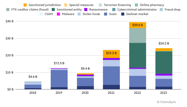 Míg 2022-ben súlyos zavarokat élt át, tavaly ismét felfelé indult a kriptovaluta-piac, és némileg tisztult is, állítja a Chainalysis a múlt évet értékelő elemzésében. 2023-ban jóval kevesebb pénz áramlott illegális számlákra, mint egy évvel korábban: 24,2 milliárd dollár, míg 2022-ben az érték közelített a 40 milliárdhoz (ez tartalmazza például az FTX-szel szembeni 8,7 milliárd dolláros hitelezői követeléseket is). Az elemzés azonban arra figyelmeztet, hogy ez egy alsó becslés, amely a Chainalysis által azonosított illegális számlák megfigyelésén alapul – azaz ez az összeg nőni fog, amikor sikerül azonosítani további illegális számlákat.