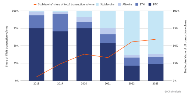 Az elemző cég szerint az utóbbi két évben átalakult a kiberbűnözés kriptovaluta-használata. 2021-ig a bitcoin volt a kiberbűnözők általánosan elfogadott csere- és tartalékdevizája, valószínűleg a magas likviditása miatt, az elmúlt két évben azonban előretörtek a stabilcoinok, az illegális tranzakciók többsége már ilyen kriptovalutákkal zajlik. A stabilcoinok részesedése egyébként általánosan is nő kriptovaluta-tranzakciókban. Bizonyos területeken – darknetes piacok, ransomware váltságdíjak – azonban továbbra is a bitcoin az általános csereeszköz.
